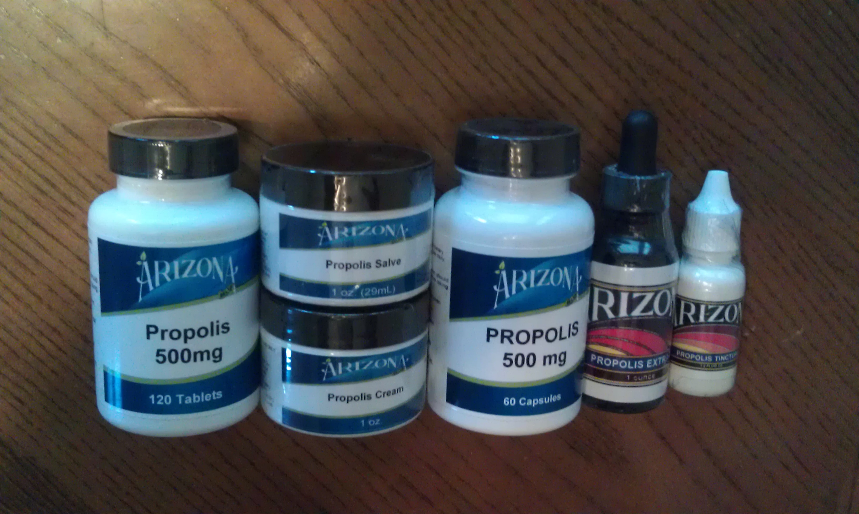 500 mg of propolis in a tablet form that may be dissolved in the mouth or swallowed. Contains honey solids and carob.